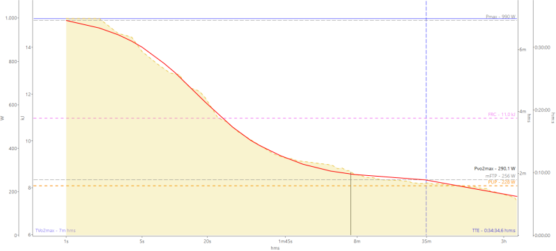 En la imagen de arriba podemos observar los datos, donde la línea roja en el modelado del programa, la líneas amarillas son los mejores registros del ciclista, además también se puede ver mFTP, PUP, Pvo2Max, FRC y Pmax.