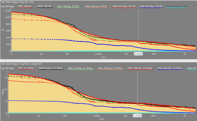 Vemos como después de una gasto de 30KJ/KG su perdida es de 0.3 W/KG en 15min. Pasa de hacer 5.7W/KG en fresco a 5.4W/KG en fatiga Esto supone una perdida de 17W absolutos.